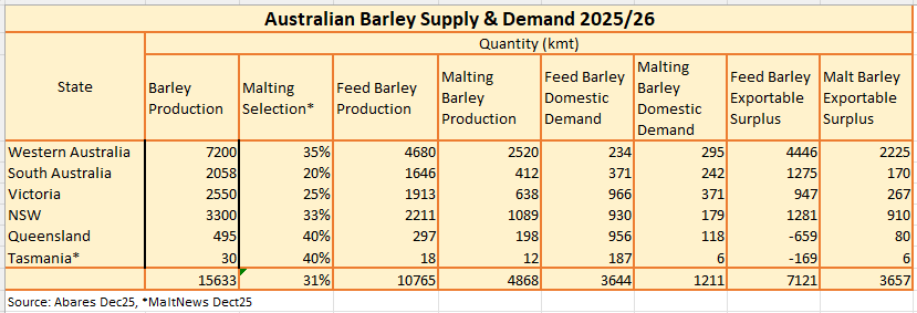 With such a large crop, Maltsters and Brewers are turning their attention to selection rates. Industry news thus far has mostly above average selection rates being recorded. If this trend continues, Australia will potentially become the largest producer of malting barley globally: with just under 5mmt available and an exportable surplus of 3.7mmt.
