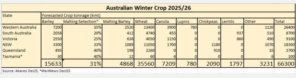 The Australian Crop 25/26 is close to completion, with 98% of the estimated crop in the bin. Using bulk handler receival data, week ending 4 January, and estimates of on-farm and private storages, we have it that 65mmt of the winter crop has been harvested and just 1.5mmt to come.